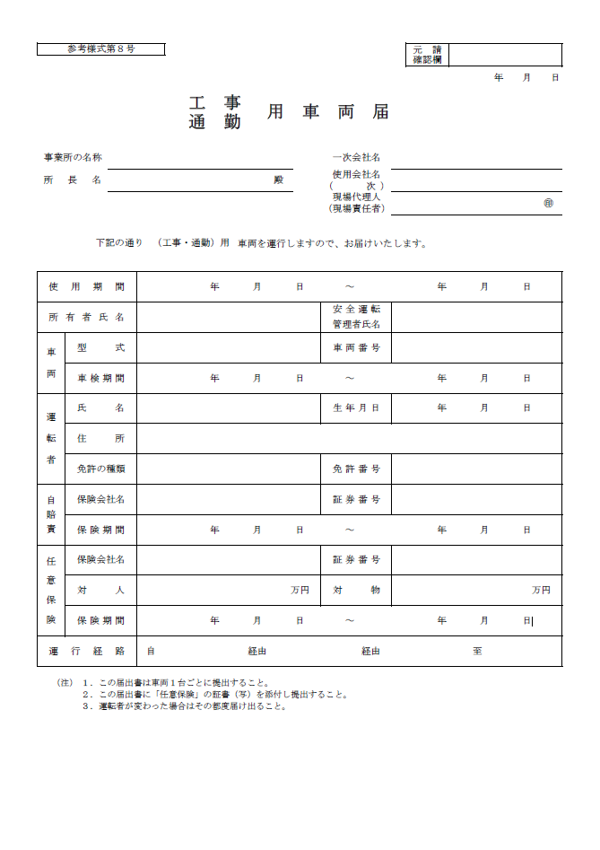- 工事・通勤用車両届【全建統一様式参考様式第8号】