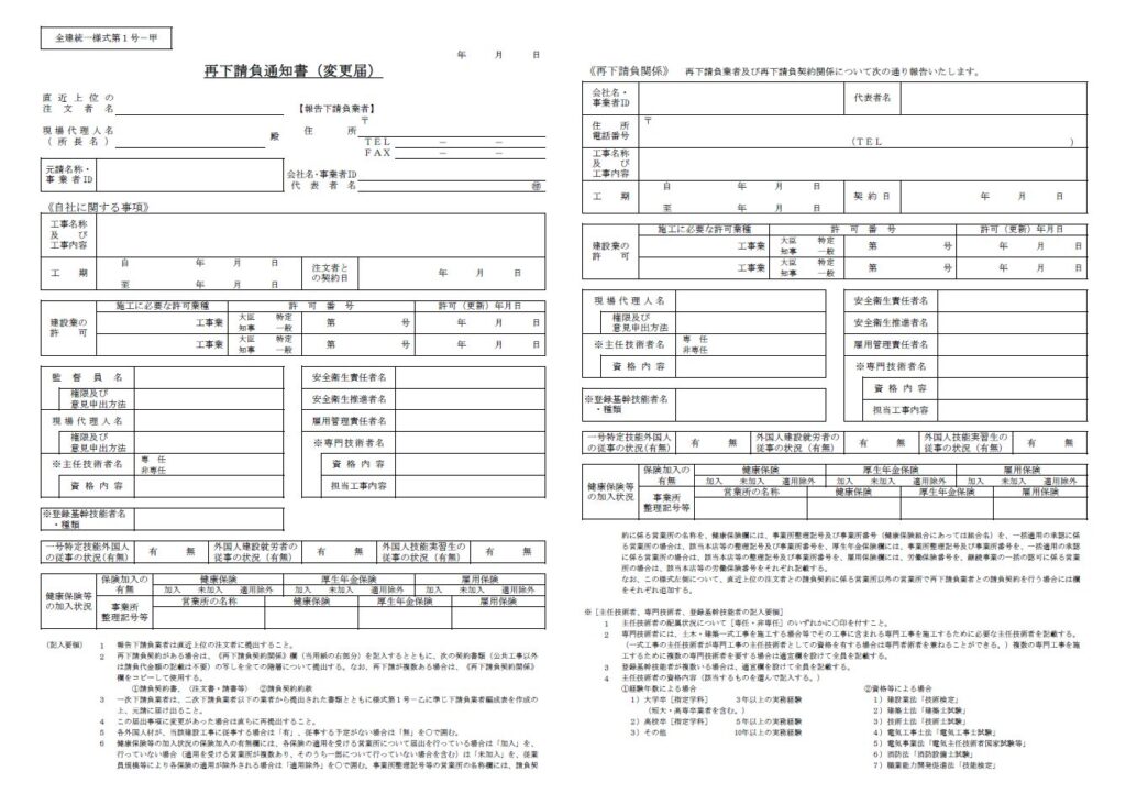 - 再下請負通知書(変更届)【全建統一様式第1号-甲】