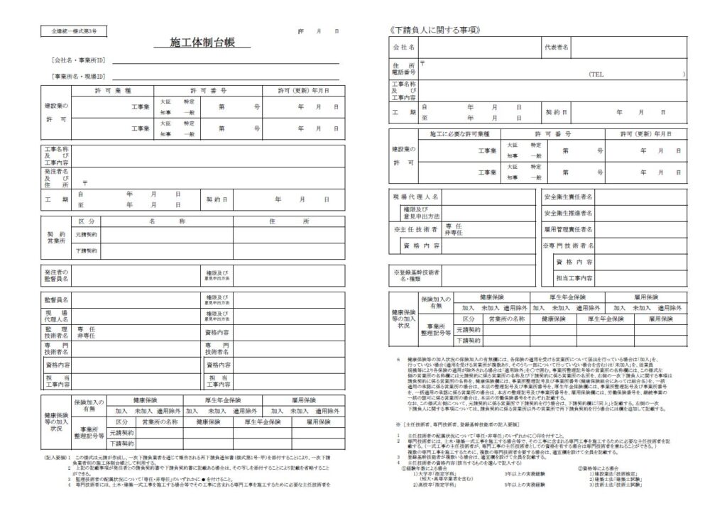 - 施工体制台帳作成建設工事の通知【全建統一様式第2号】