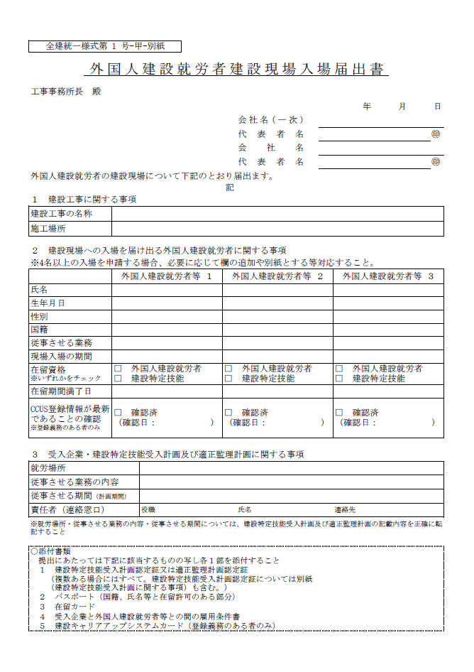 - 外国人建設就労者等現場入場届書【全建統一様式第1号-甲-別紙】