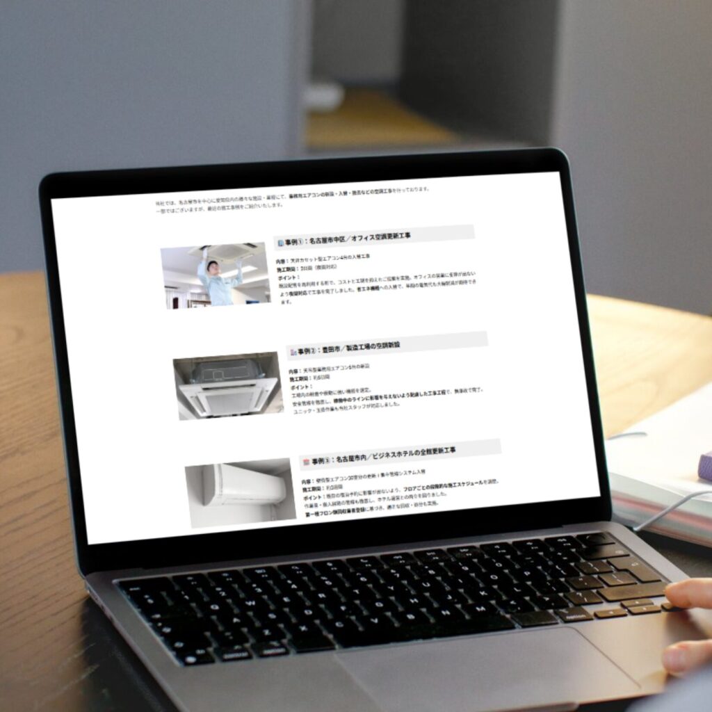 「地域名+工事業種」で検索されやすいようSEO対策を実施。施工実績や会社情報を最適化し、新しい仕事のチャンスにつなげます。